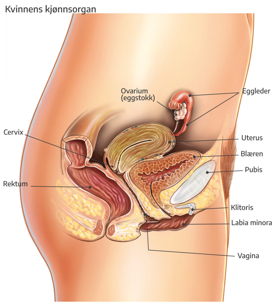 Figur 5 gir en oversikt over den ytre og indre anatomien til kvinnens reproduksjonsorganer. Kvinnens underliv er designet for tre hovedfunksjoner: