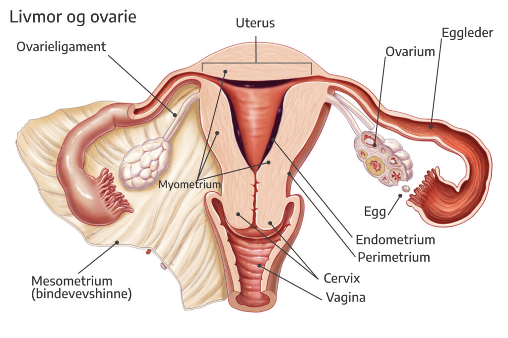 Uterus er et relativt tykt, muskuløst organ som ligger i pelvishulen, anteriort for rektum, men posterosuperiort (over på baksiden) i forhold til blæren (fig. 5 og 7). Funksjonen til uterus er å motta et befruktet egg, holde på og gi næring til det, og til det utviklende embryoet/fosteret.